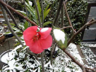 ここは 講師の日常の落書きと まれにお知らせなと書いています 雪の朝 さてさて 季節は春ですが 投票日の今日は大寒波とか 朝 起きてみると雪が 愛車の後ろ姿 馬の背中と屋根に雪 (@_@) 木瓜の花の上にも 昼頃には溶けていました 部屋の中の空気が冷たいのは いつも通り❔です (T_T)/~~~